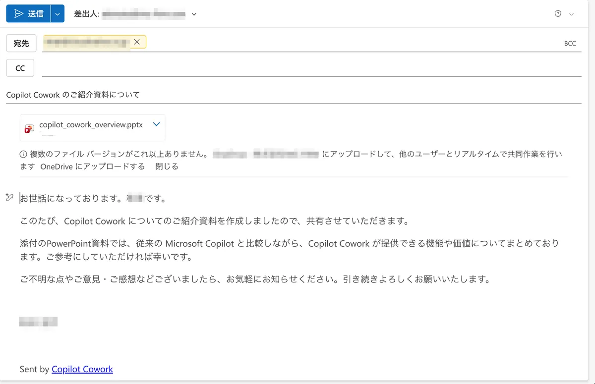 Copilot Cowork自身にCopilot Coworkの説明資料を作成させ、メール送信させた