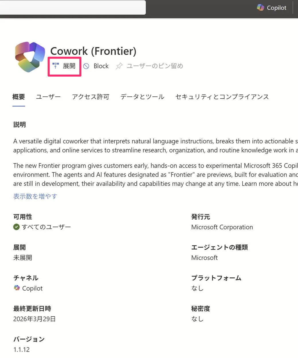 さて、Copilot Coworkの詳細にはいる前に、IT管理者目線でCopilot Coworkの展開方法を解説します。あくまでFrontierプログラムのCopilot Coworkを利用するための手順であり、一般展開された場合は手順が異なる可能性があります。