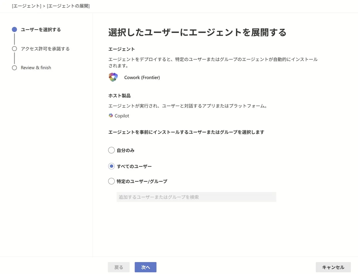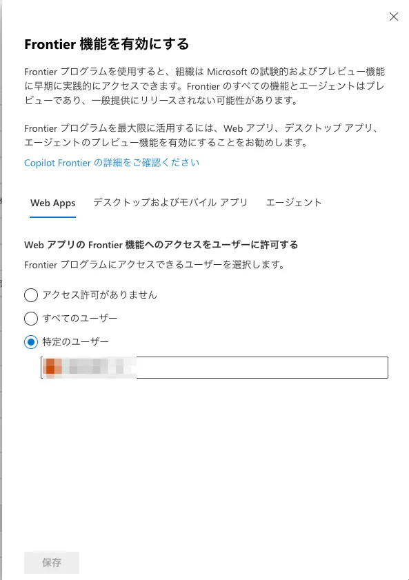 Frontier機能にアクセス可能なユーザーを指定します。グループ指定はできませんのでユーザー単位で指定するか、すべてのユーザーに許可するかのいずれかで対応します。(組織でCopilotライセンスを利用するユーザー層にもよるでしょう)