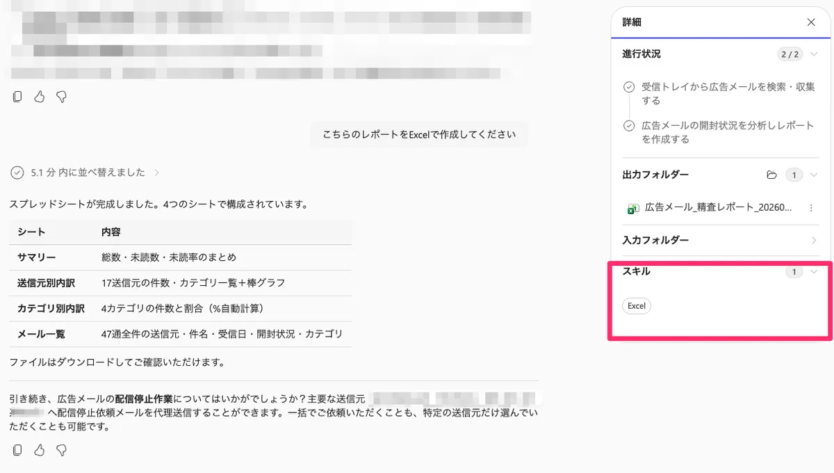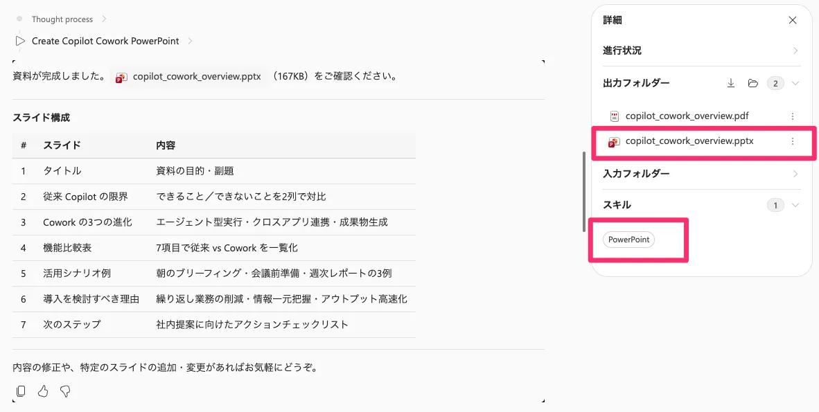 注目は「スキル」という表示です。今回はPowerPoint形式のファイルを作成するので、PowerPointの作成や編集を行う「スキル」を利用してファイルを出力しています。Copilot Coworkがスキルを駆使してタスク処理をおこなっており、スキルが今後拡張や追加されることでできることが増えていきます。また、ユーザー自身でスキルを作成することも可能です。