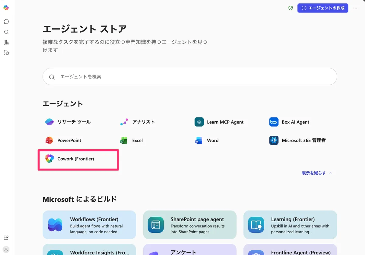 ここからはユーザー作業になります。Copilot Coworkを展開したユーザーの環境上でCowork(Frontier)が表示されていればOKです。検索からも見つけられます。以降はエージェントリストから呼び出すのもよいですが、ピン留めをお勧めします。