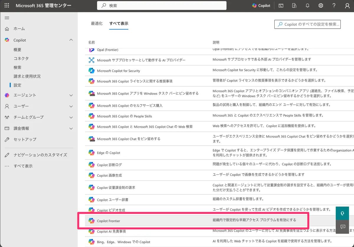 そのまま、Microsoft 365 管理センターで Copilot>設定>Copilot Frontierを選択します。