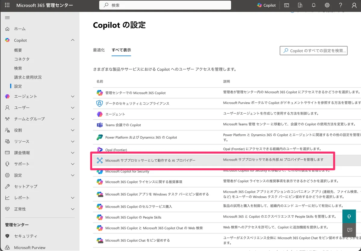 Microsoft 365 管理センターにサインインし、Copilot>設定>Microsoft サブプロセッサーとして動作する AI プロバイダーを選択します。