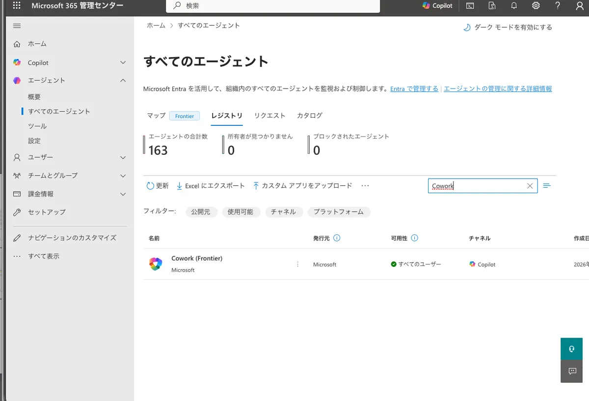 そのまま、Microsoft 365 管理センターでエージェント>すべてのエージェント でエージェントの一覧から「Cowork (Frontier)」を指定します。絞り込み検索すると簡単です。