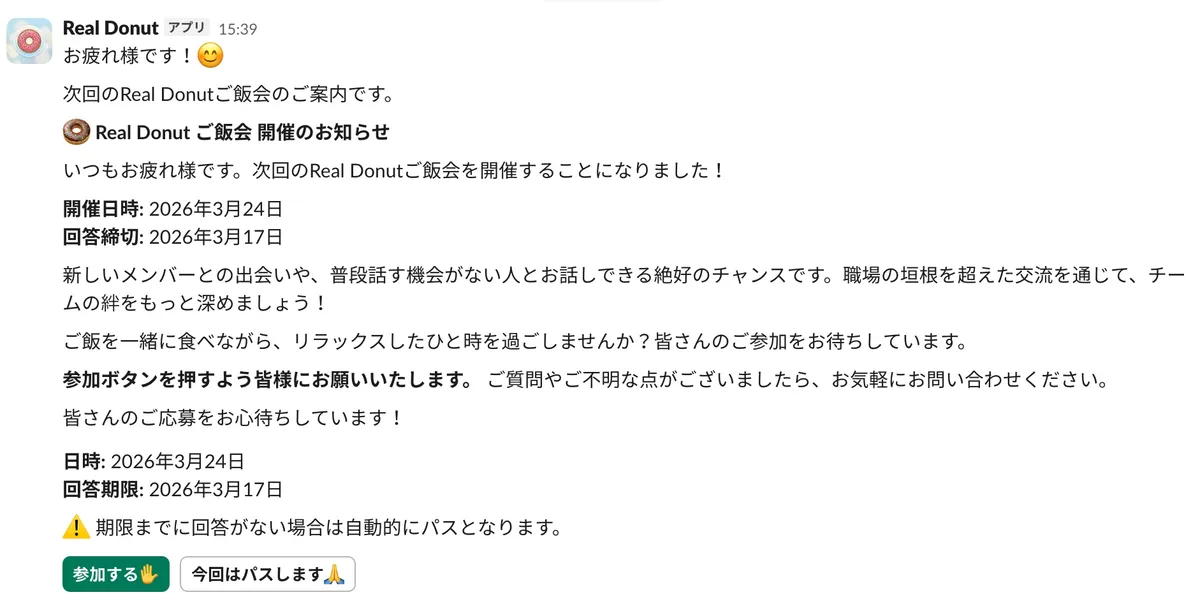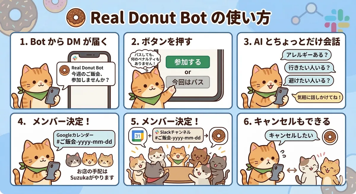 Real Donut は、ランダムにメンバーを選んでご飯会をセッティングしてくれる Slack Bot です。
