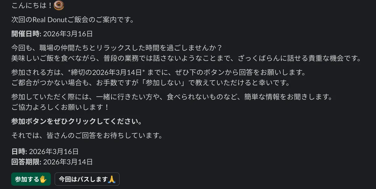 Real Donutのすごいところは、Slack Botが参加登録からアレルギー有無の確認、マッチングまでサポートしてくれることです。弊社代表のシンジさんが作ってくれました!