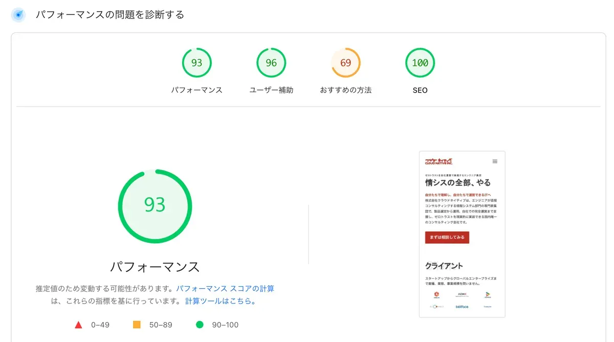 現在は、Astro + SCSS + MDX の静的サイトに置き換えました。SEOスコア 100点です。AEO(AI向けのやつ)にも注力しまくってます。インフラはAWS の Amplify です。Amplify はいいぞ。ポチポチするだけでお手軽にWebインフラ作ってくれるし WAF までついてる優れもの。Github更新されると勝手にWebサイトも更新してくれる。
