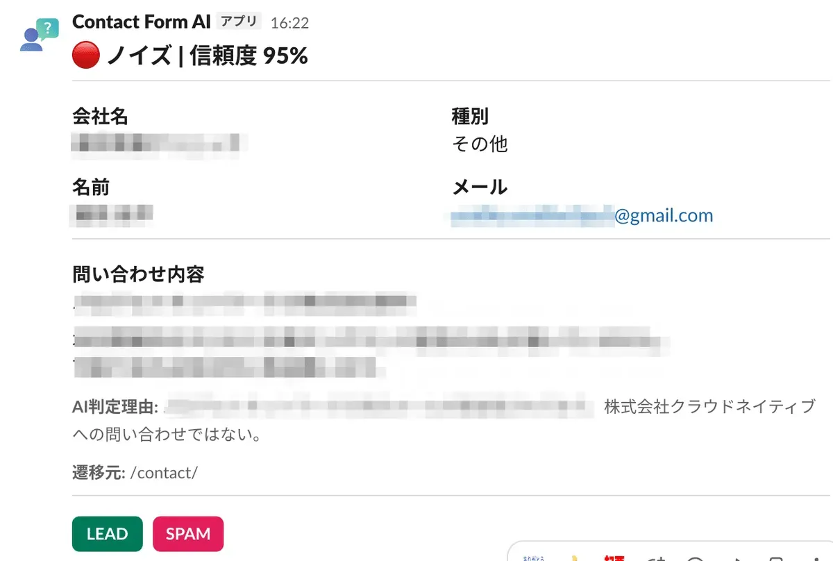 → Claude AI が問い合わせ内容を分類(LEAD / REVIEW / SPAM)