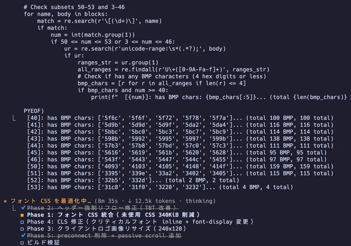 そしてパフォーマンスチューニングのラストスパート。ここで一番インパクトのあった改善をやりました。フォント CSS をメインバンドルから分離して非同期読み込みに変更。メイン CSS が 1MB から 225KB に縮小。CSS のインライン化も試したんですが、逆にパフォーマンスが悪化したので即 revert してます。こういう「やってみたけどダメだった」が記録に残るのも git のいいところです。