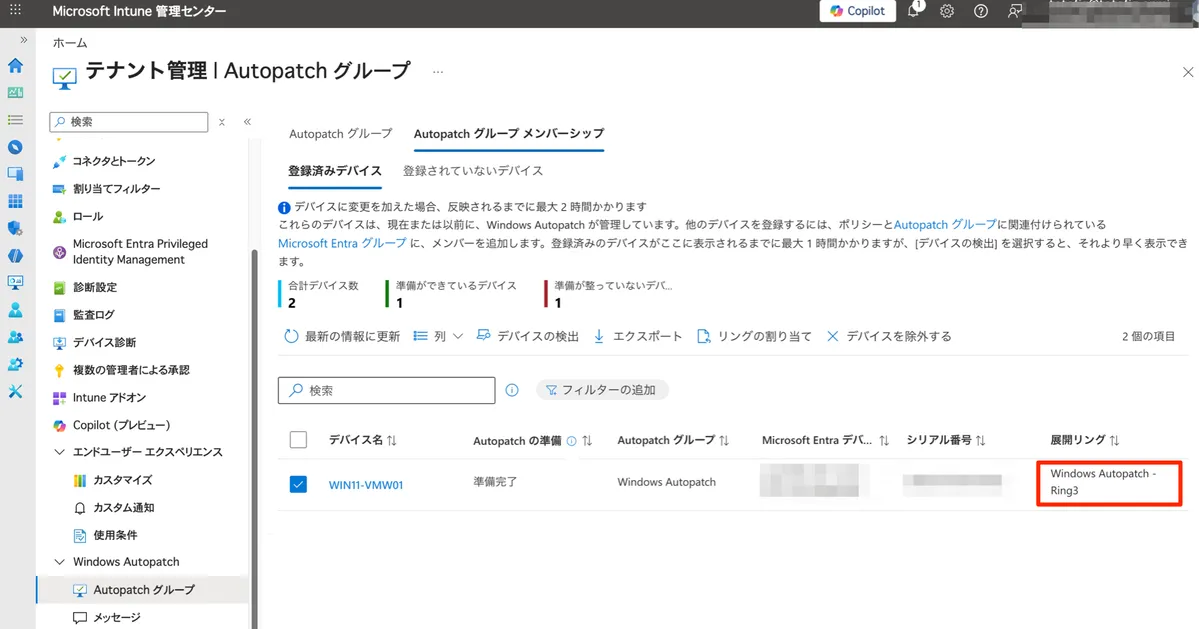 - [テナント管理] > [Autopatch グループ] > [Autopatch グループ メンバーシップ] タブ > [登録済みデバイス] タブで登録状況を確認