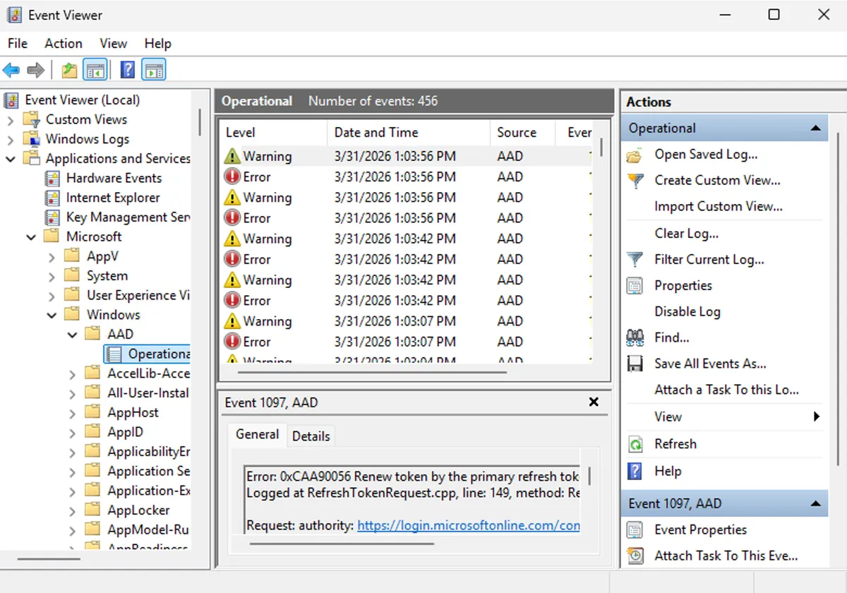 アプリケーションとサービスログ > Microsoft > Windows > AAD > Operational
