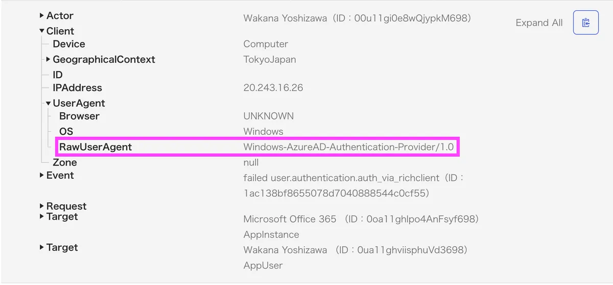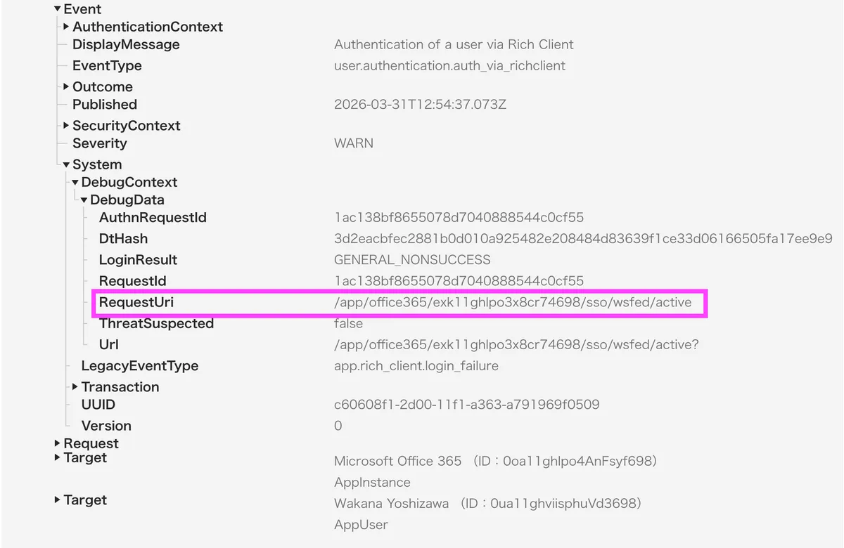- Okta のログだけ見ると「パスワード間違い」にしか見えないが、User-Agent と request_uri を確認すればバックグラウンドプロセス起因かどうか判断できる