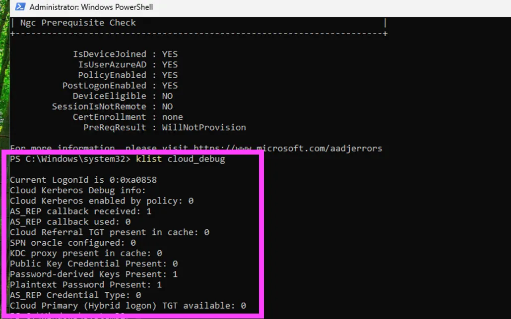 Public Key Credential Present: 0:Windows Hello の鍵がないPassword-derived Keys Present: 1:パスワード由来の鍵ありPlaintext Password Present: 1:平文パスワードがキャッシュされている