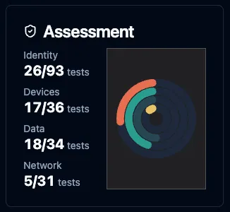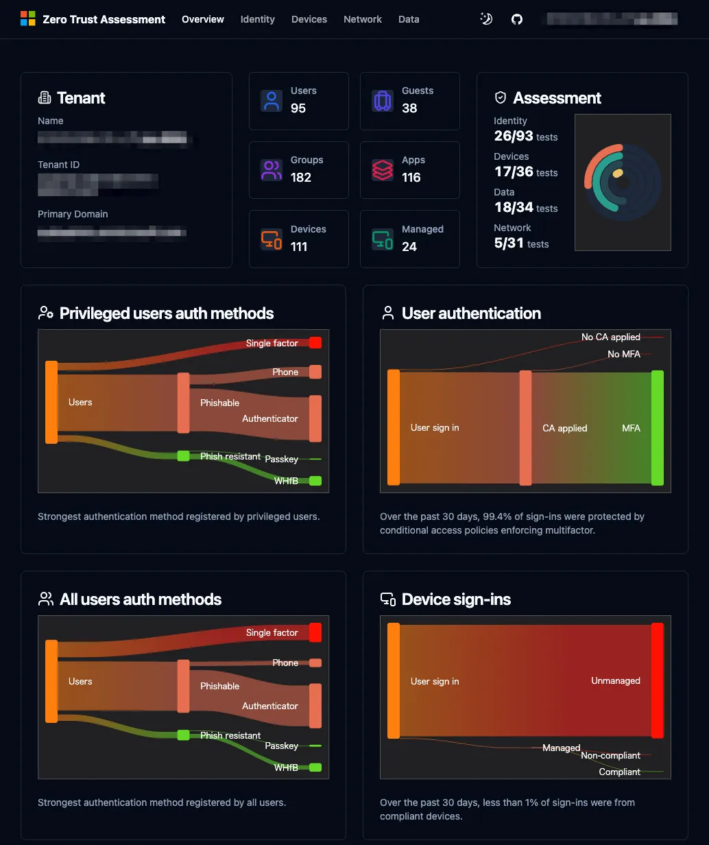Zero Trust Assessment Toolは、Identity, Device, Network, Dataにおいて、ゼロトラストの観点でテナントのセキュリティベースラインを可視化するものです。これを実行することで、グラフィカルに可視化された「概要」と各柱のセキュリティベースラインの達成状況を確認できます。