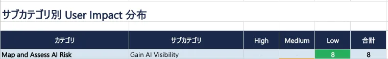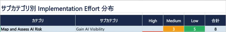 可視化カテゴリである「Map and Assess AI Risk」のサブカテゴリ「Gain AI Visibility」を見てみると、そのほとんどがLowであることがうかがえます。