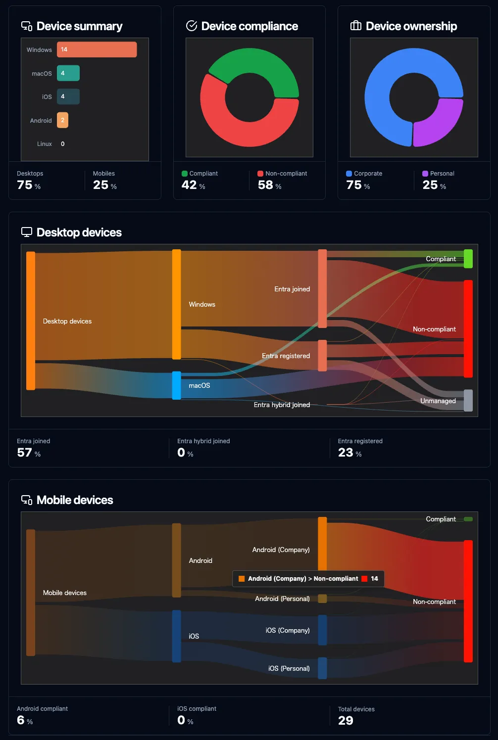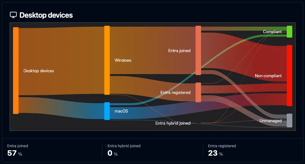 Desktop device(Windows, macOS, Linux)の管理方式(Entra Joined, Entra Registered, Entra hybrid Joined)の分布、およびコンプライアンスへの準拠状況が可視化されています。