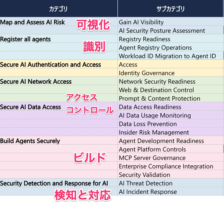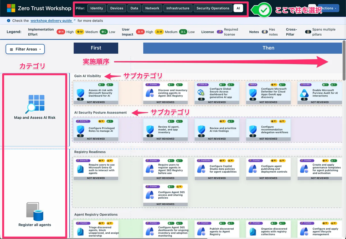 AIの柱のカテゴリは、大きく分けて可視化、識別、アクセスコントロール、ビルド、検知と対応の順に並んでいますので、まずは可視化から手を付けるのがいいでしょう。